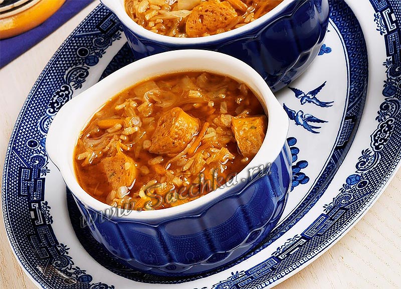 - Подать с поджаренными сардельками.