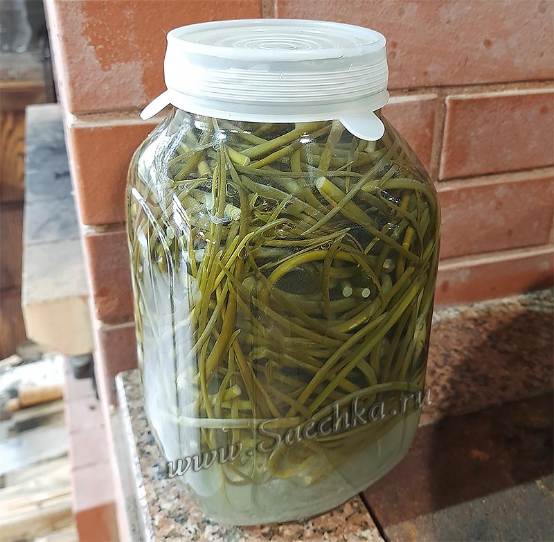 - Через 1-1,5 недели, когда брожение закончится, долить солёные стрелки чеснока свежим рассолом, закрыть крышками и поставить в холодное место (в холодильник).