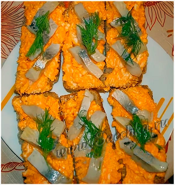 - Намазать на остывший хлеб получившуюся яично-сырную намазку и сверху выложить кусочки селёдочки.