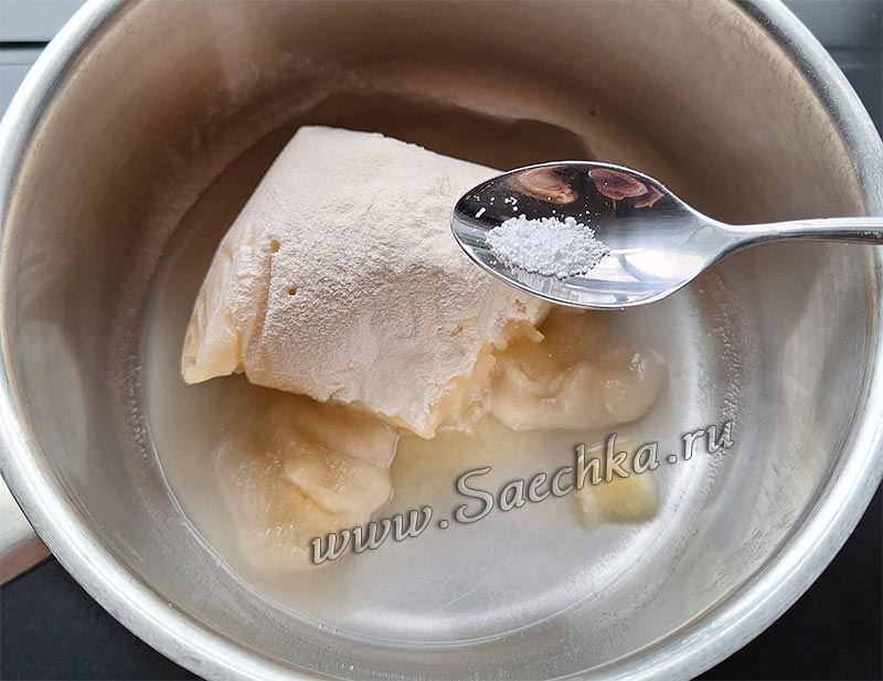 - Поставить сотейник на небольшой огонь, добавить воду и оставшийся сахар. Довести до кипения: