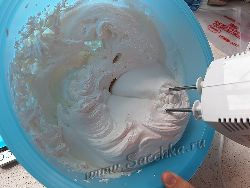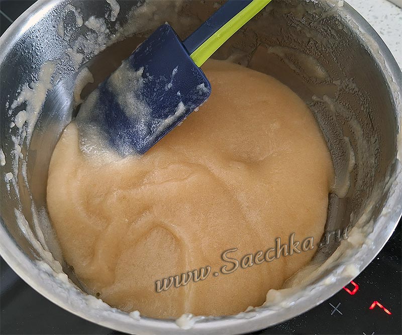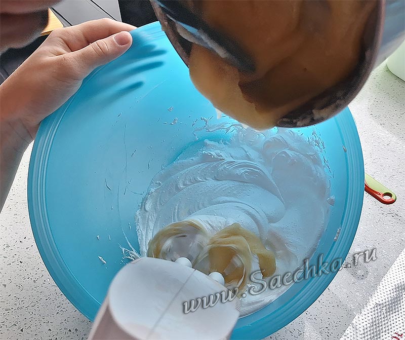 - Добавить, постоянно взбивая, небольшими порциями яблочную массу ко взбитым белкам: