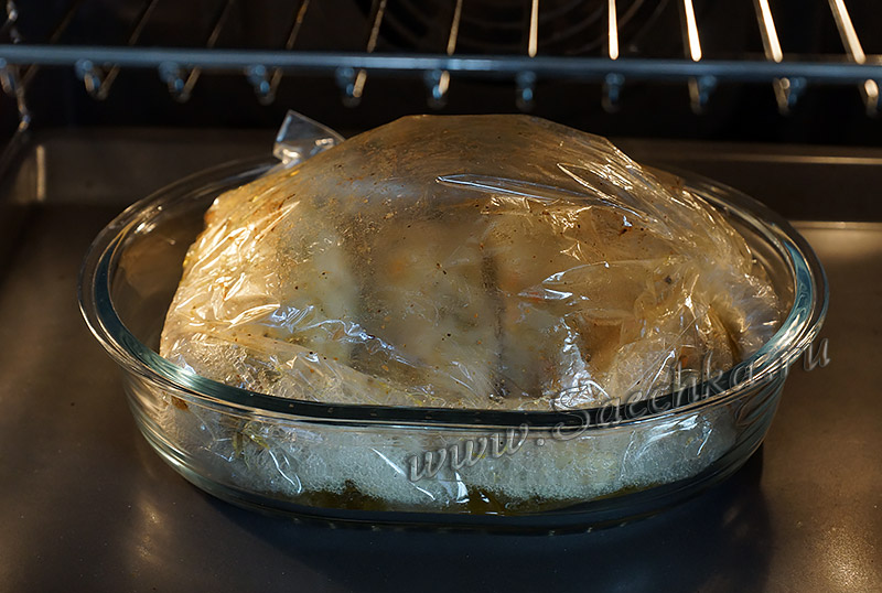 - Концы пакета завязать или закрепить специальными зажимами. Проколоть зубочисткой или ножом в нескольких местах, чтобы обеспечить выход пара при запекании в духовке.
