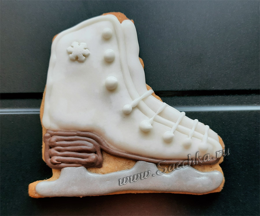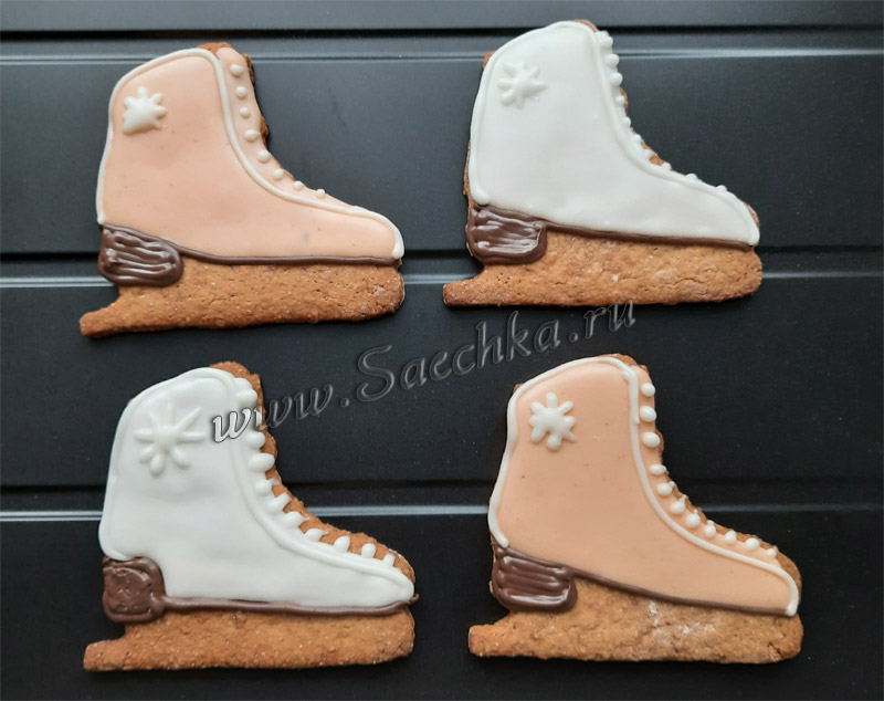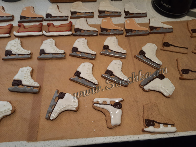 - После запекания и охлаждения имбирные пряники расписали: Коньки делали двух цветов. Каждому цвету надо давать полностью просохнуть, иначе красители на глазури начинают смешиваться.