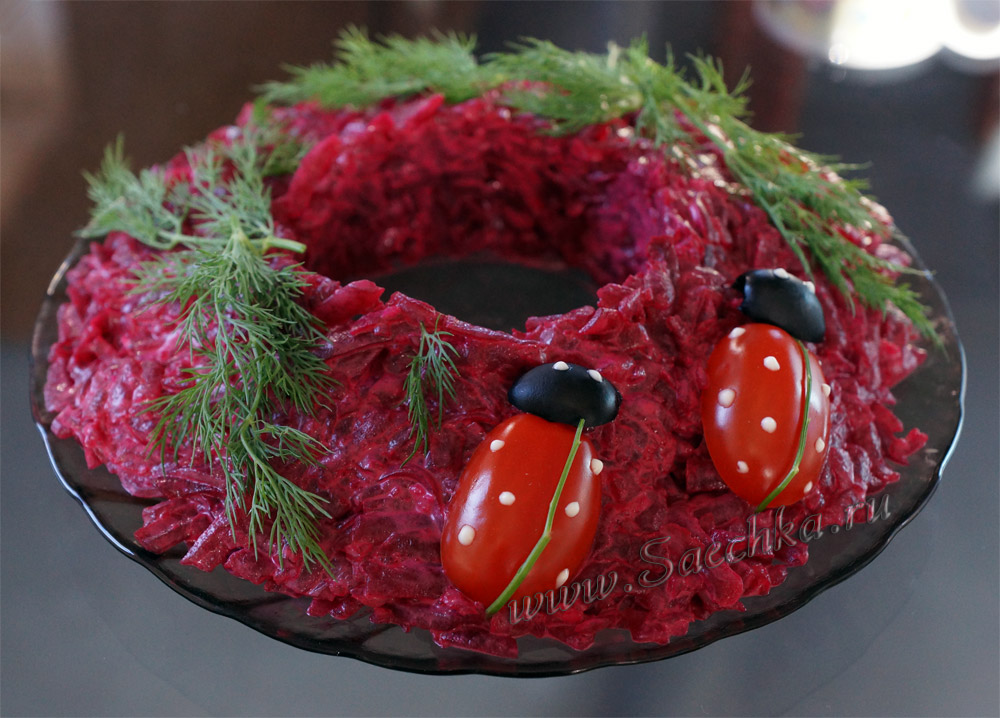 - Для украшения на тарелку поставить в центр стакан, салат из свёклы выложить по кругу, затем стакан аккуратно вытащить.