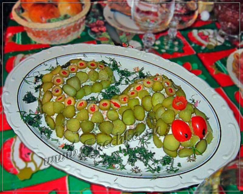 Для основы можно взять любой из любимых салатов. У меня - традиционный новогодний оливье.