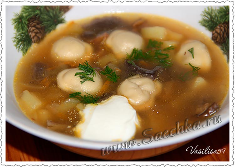 - Подавать грибной суп с пельменями вместе со сметаной и нарезанным укропом.