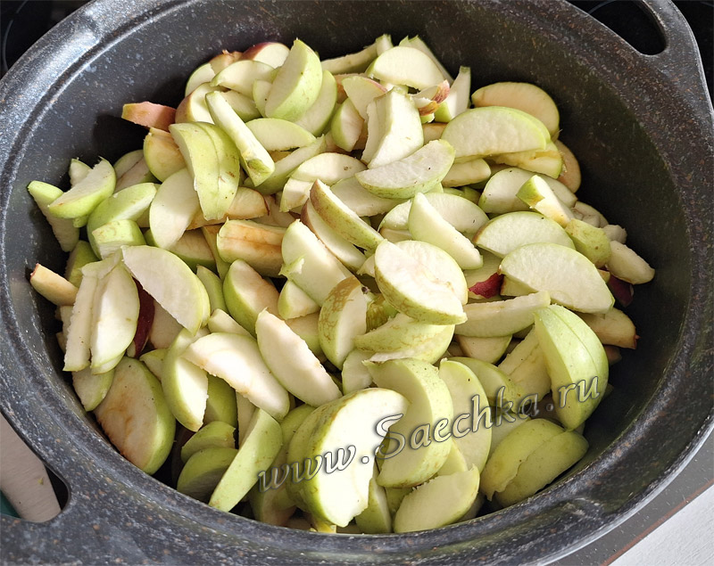 - На самом деле, у меня было не 5 кг яблок, а 5-ти литровая кастрюля, которую я почти полностью заполнила нарезанными на дольки яблоками: