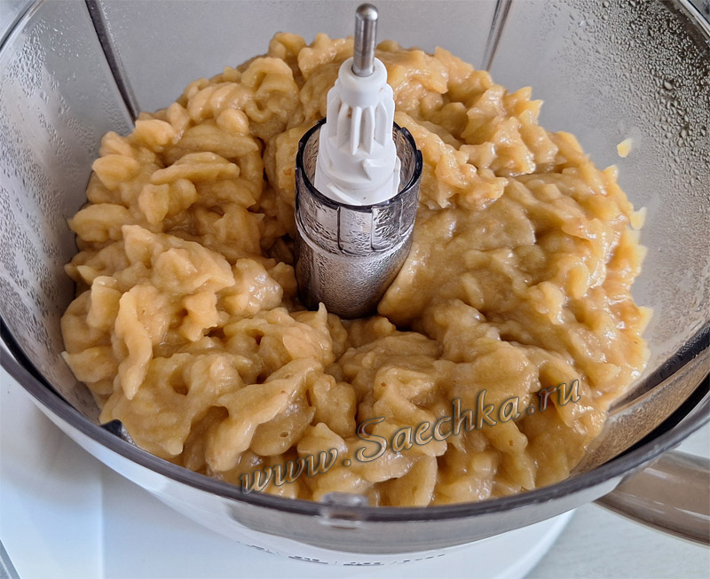 - Распаренные яблоки либо протереть через сито, либо воспользоваться специальной насадкой для комбайна: