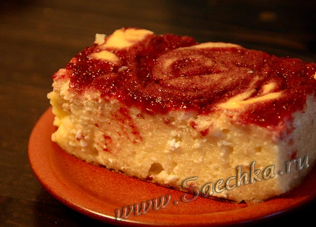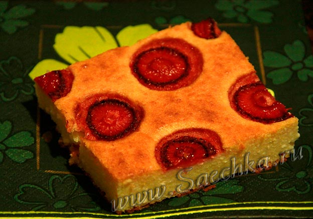- Получается запеканка высокая, пышная, как в детском садике. Мы разнообразим её то карамелью, то яблоками или любыми ягодами. Вот с клубникой: