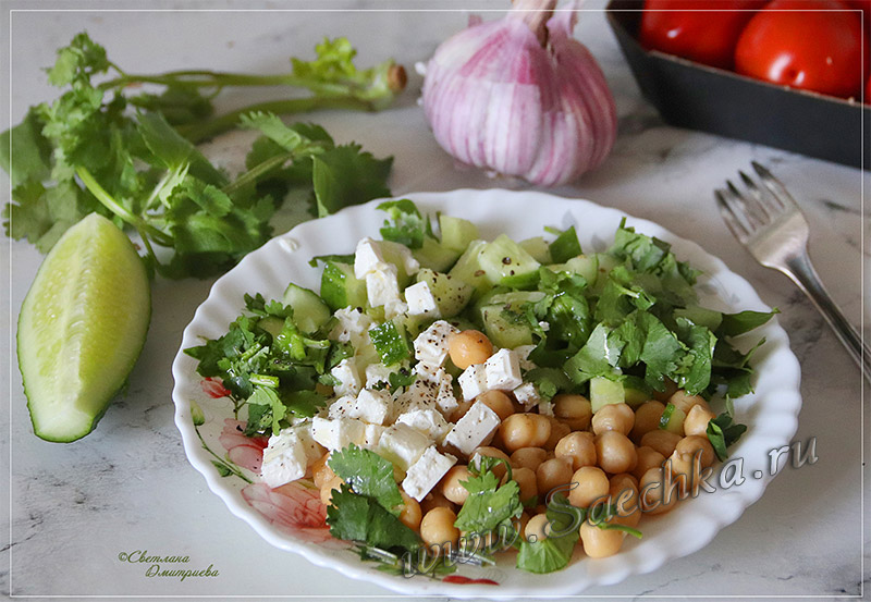 - Заправила салат с нутом и брынзой подсолнечным маслом.