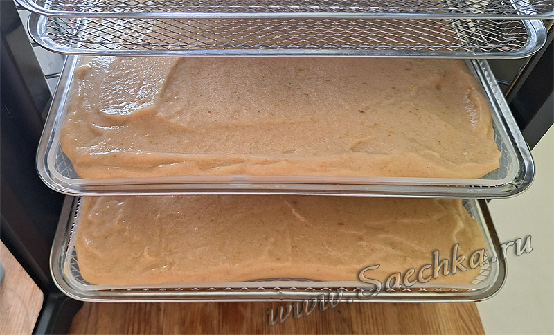 - Дегидратор поставить на 70 градусов С и 8 часов. Мне этого времени не хватило, потом ещё 5 добавила. Итого, моя воздушная пастила из яблок сохла 13 часов в дегидраторе.