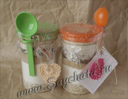 Чем запомнятся нам зимние душевные домашние посиделки? Конечно же, ароматами кухонных запахов и совместными трапезами. А что, если облегчить задачу и подарить близкому человеку необходимый «полуфабрикат»? Для запоминающегося и полезного подарка достаточно засыпать сухие составные части любимого рецепта печенья в декоративную стеклянную банку, плотно закрыв ее крышкой. Интересное решение – прикрепить к банке мерную ложку или формочку для вырезания будущего печенья из теста. Разумеется, не забываем и о самом рецепте, который прикладываем к подарку в виде инструкции.