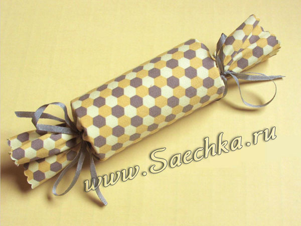 Упаковать подарок можно любой – как совсем маленький, так и довольно большой. В идеале подарок должен быть цилиндрическим или прямоугольным и продолговатым. Для материала обертки можно использовать как обычную подарочную бумагу или фольгу для цветов, так и материалы пооригинальнее: если речь идет о маленьких подарочках, то можно взять лист с нотами, карту, ткань или кружево. Можно взять и обычный картон и вырезать конфетку по схеме, а затем сложить по нужным линиям. Перевязать «конфету» с двух сторон можно лентами, нитками, веревкой или тесьмой, а украсить ее – карточкой с именем получателя или композицией в виде цветочков, снежинок, пуговиц, засушенных пластиков апельсина и палочек корицы.
