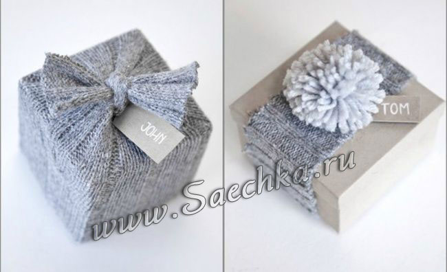 Если ваш подарок держит форму – к примеру, в коробочке – то можно упаковать его в самую уютную обертку. Вам понадобится кусок вязаного свитера или любой другой вещи желательно крупной вязки, идеально подойдет рукав. Завяжите ткань красивым мягким узлом – упаковка готова. Еще более уютным упаковку можно сделать, пришив к ткани несколько пуговиц или завязав бант из атласной ленты, можно также вырезать елочку или снежинку из картона с интересным принтом, украсить узел настоящей шишечкой или красивой веточкой, припорошенной искусственным снегом (не тающим), помпоном или миниатюрной елочной игрушкой (ее можно сделать и самостоятельно, разукрасив арахис в скорлупе).