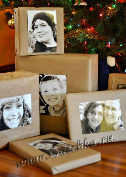 Этот вариант особенно подойдет тем, кто кладет подарки под елку, и тем, у кого большое семейство или планируется хотя бы несколько гостей. В таких случаях подарки обычно подписывают, мы же поступим более оригинально – но для этого вам заранее нужно собрать фотографии всех членов семьи или гостей. Распечатайте фотографии и к каждой упаковке приклейте небольшое фото – чтобы от него ничего не отвлекало, бумага может быть даже однотонной. Если вы хотите придать нотки ретро вашему подарку, распечатайте фото в черно-белом или коричневатом варианте, можно также немного опалить края снимка. Чтобы усилить впечатление старины, можно добавить в оформление подарка полоску кружева.