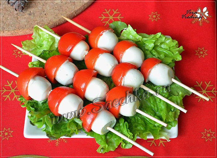 - Надеть шляпку из помидора черри на ножку (фаршированное яйцо) и проткнуть насквозь шпажкой.