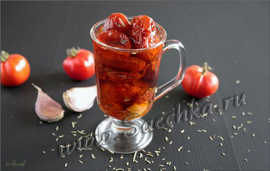 - Помыть и обсушить помидоры, выложить на противень, покрытый бумагой и подвялить в духовке, включённой на 80-90 градусов С, в течение 3-4 часов. Помидоры должны как следует подсохнуть, сморщиться, но не высохнуть полностью.