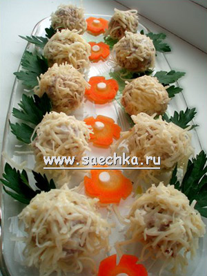 - Сделать из полученного фарша маленькие шарики, обкатать в сыре, натертом на средней терке.