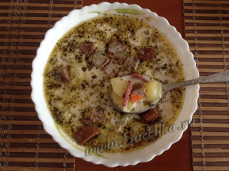 Сырный суп приготовлен с колбасой, подаётся горячим с мягким свежим хлебом.