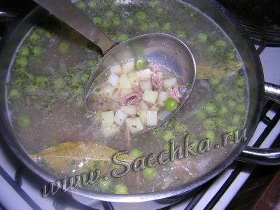 - Когда картошечка почти готова закладываем к ней горошек с лучком и варим минутки 3-4.