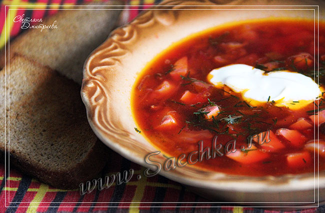 Московский борщ приготовлен со свёклой, картофелем, морковью и капустой - тут всё классически, но в него еще добавлены любые мясные продукты из холодильника.