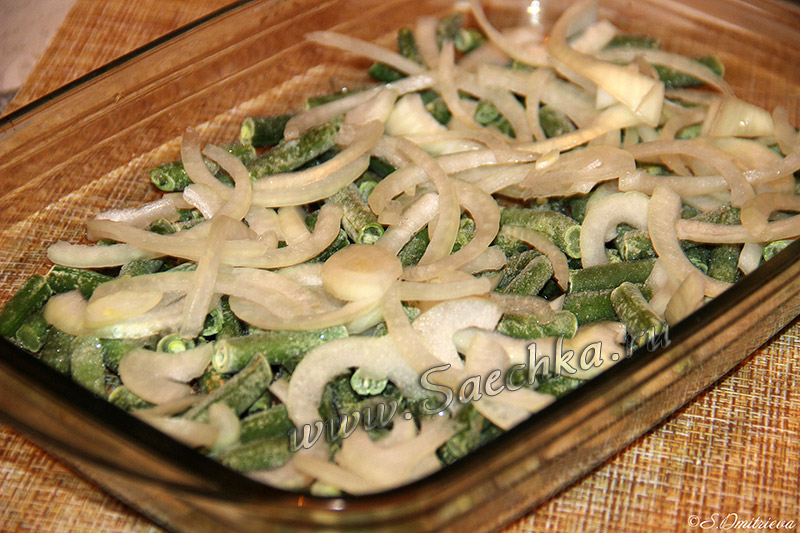 - На дно формы для запекания положила замороженную стручковую фасоль.