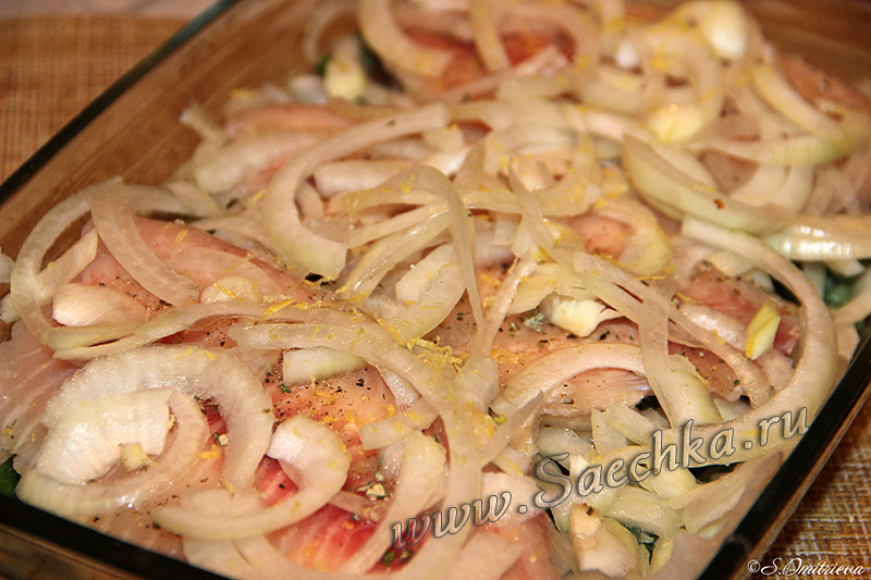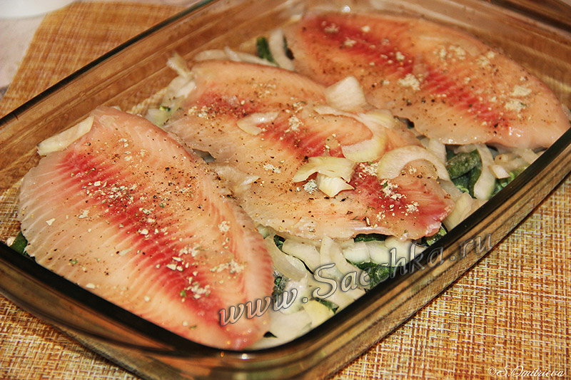 - На овощи положить замороженное филе тилапии. Сверху обмыла под краном. Сбрызнула лимонным соком (совсем слегка), натёрла цедру, тем более, что она гораздо полезнее самого лимона, посолила, поперчила, посыпала специями для рыбы.