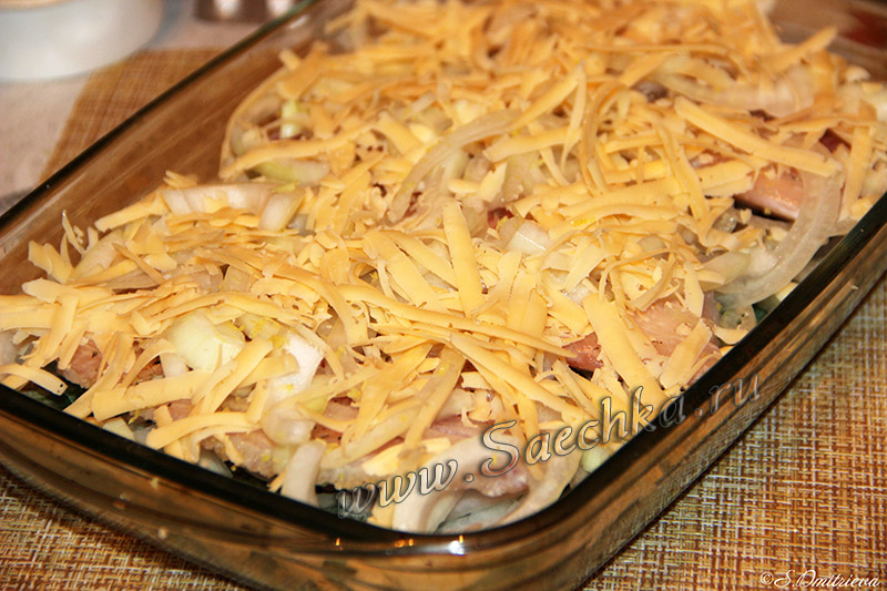 - На неё - нарезанный полукольцами репчатый лук. Я к луку в любом виде отношусь хорошо, но если кто не любит лук в таком виде, то, конечно, придётся сначала пассеровать. Слегка посолить.