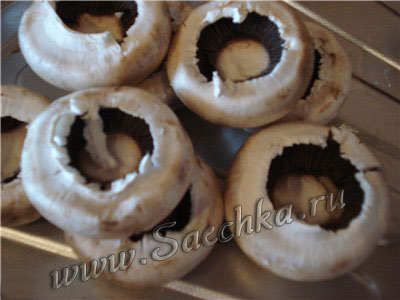 - Этим фаршем начиняем шляпки грибов, посыпав сверху тертым сыром.