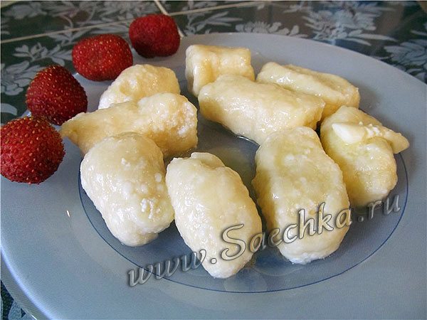 Ленивые вареники приготовлены из творога, подают их с сахаром, сметаной или сливочным маслом.