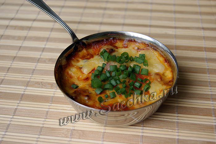- Затем переложить в форму или по индивидуальным кокотницам, посыпать натёртым сыром и поставить в духовку на 170 градусов, пока сыр не расплавится.