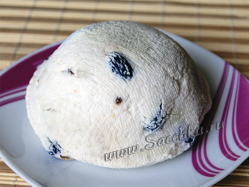 Творожная ванильная пасха приготовлена со свежей сметаной и сухофруктами.