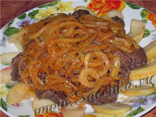 - Снимаем, выкладываем лук, нарезанный кольцами. Солим, добавляем паприку, карри, и, постоянно помешивая, жарим его до состояния, когда уйдет горечь, и он начинает становиться мягче, но еще немножко хрустит, как бы почти до готовности. Лук пропитывается уже печеночно-яблочными соками.