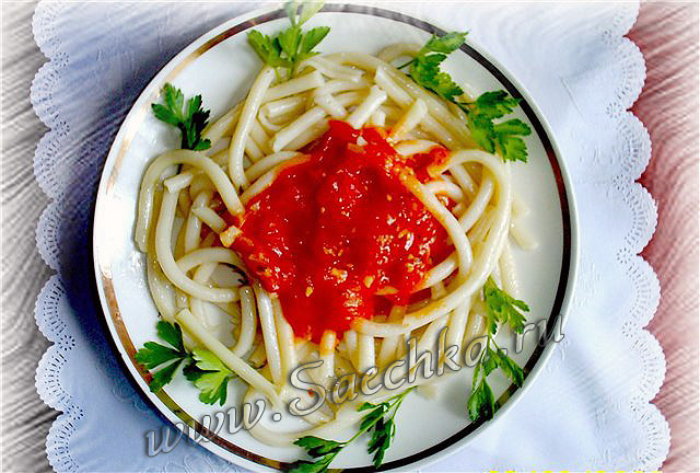 - Макароны разложить по тарелкам с томатным соусом из запеченных помидор и подать на стол, украсив, по желанию, листочками базилика или другой зеленью.