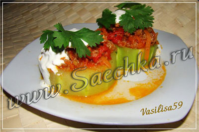 - Готовые кабачки выкладываем в посуду, в серединку ложкой выкладываем фарш.