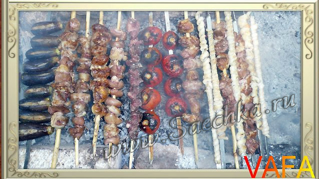 - Помидоры нанизываем на шампура. Маленькие баклажаны надрезаем, солим внутри, кладем туда кусочек курдюка, тоже нанизываем на шампура. И все на угли...