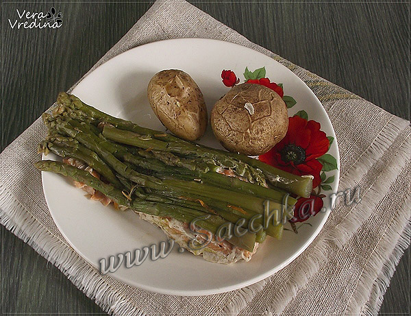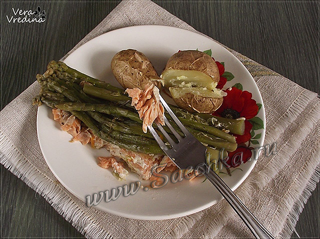 Запечённая горбуша приготовлена в духовке с картошкой и спаржей.