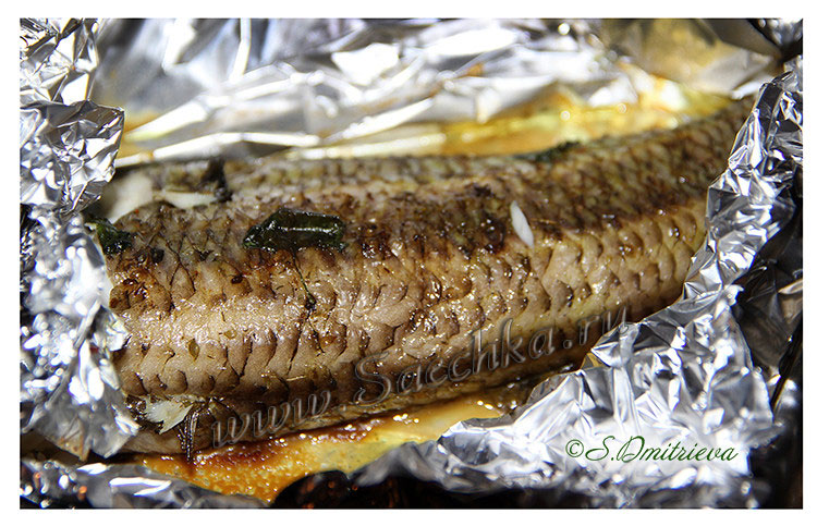 - Рыбу замариновала, т.е. смазала растительным маслом, посыпала солью, красным и черным перцем, сушеным укропом... Ну тут у каждого свои секреты.