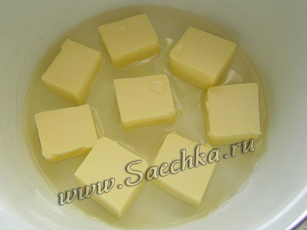 - Тесто: масло нарезать на кусочки, добавить воду, поставить на огонь, довести до кипения и сразу снять.