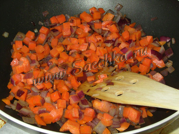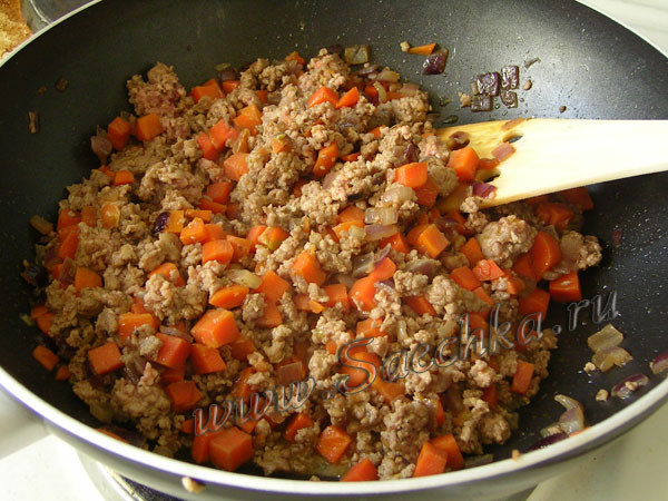 - Затем добавить нарезанное мясо или фарш, посолить, приправить. Добавить натёртые помидоры. Потушить, чтобы выпарилась жидкость.