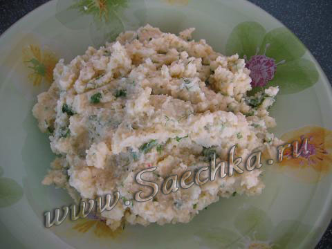 - Сыр потереть на мелкой терке, выдавить чеснок. Добавить майонез, пюре (варёный картофель) и мелко порубленную зелень. Все тщательно перемешать.