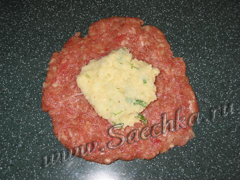 - В центр лепешки класть не более 1 ч.л. начинки. Много не надо класть, иначе зразы лопнут при жарке.