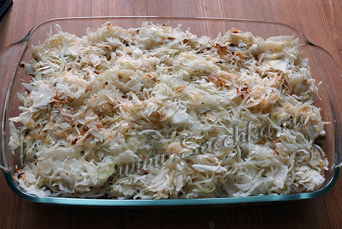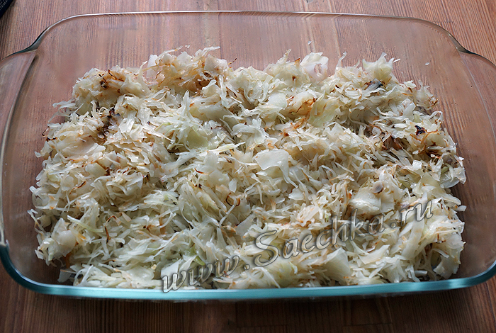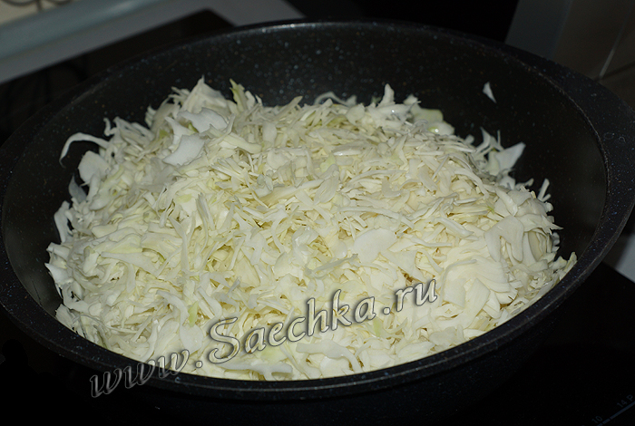 - Порубить (нашинковать) мелко капусту и обжарить. Посолить.
