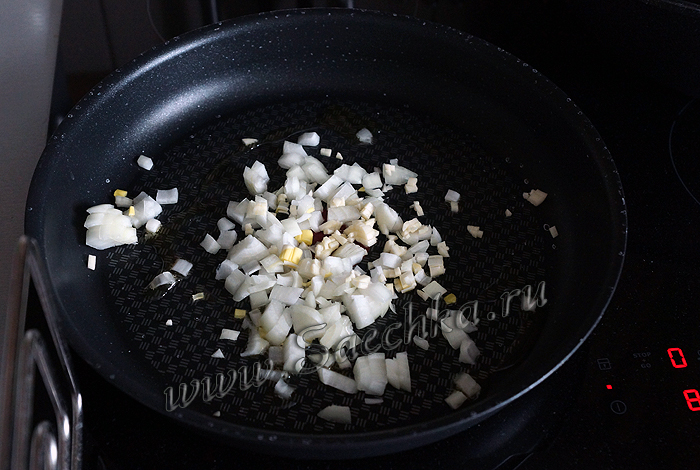 - Порубить лук (я обычно беру красный, больше нравится) и чеснок, обжарить на растительном, или оливковом масле (стала последнее время оливковое чаще брать – вкуснее!).