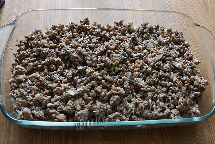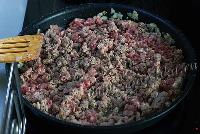 - Как только лук станет золотистого цвета, добавить фарш, обжарить его. Посолить, поперчить, добавить специи – на Ваш вкус.