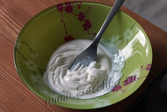 - Берём либо сметану, либо майонез, либо смесь того и другого – что завалялось в холодильнике. Смешиваем и немного разводим водичкой, если густо.