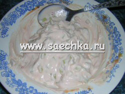 - Для соуса сметану соедините с кетчупом, добавьте мелко нарезанный огурец, перемешайте: