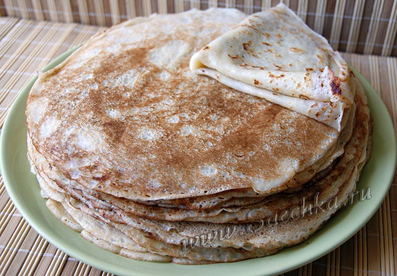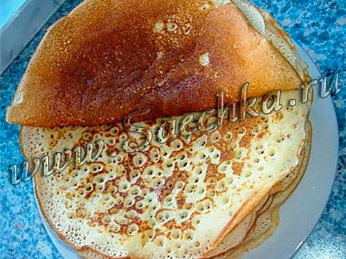 Блины приготовлены на молоке с содой - они получаются ажурными с дырочками.