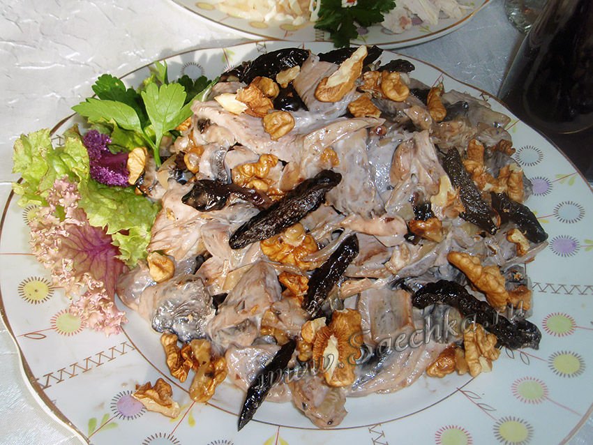 Салат приготовлен с говядиной, грецкими орехами, черносливом и шампиньонами.