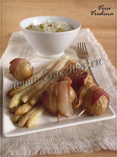 Картофель, запечённый в беконе, приготовлен в духовке. Получается хрустяще-вкусным, подавала с тушеной спаржей и салатом из дайкона.